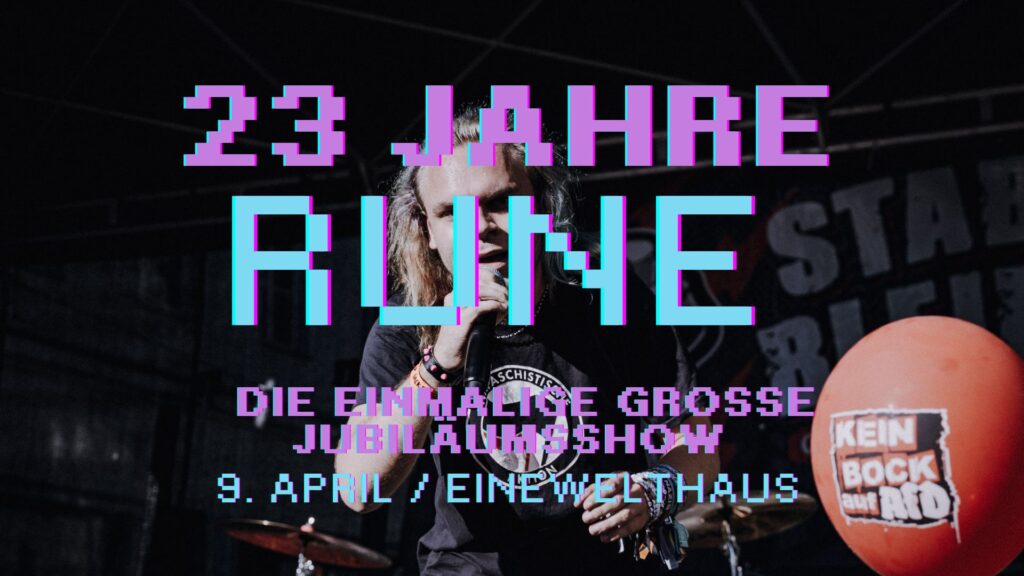 Am 9. April veranstalte ich ein Mini-Festival am Tag meines Geburtstags unter dem Motto „23 Jahre Rune – die einmalige große Jubiläumsshow & Queer Slam Spendengala“. Auftreten werden befreundete Spoken-Word-Artists, Singer-Songwriter und Punk-Bands. Kommt vorbei!
